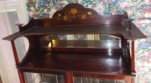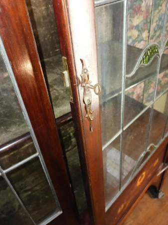 Measures 45"Wx77"Hx7 1/2". Brass inserts. Leaded and stained glass with no cracks or crazing. I believe original Velour/Velvet? material backing. 2 Shelves, non adjustable, also lined.