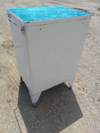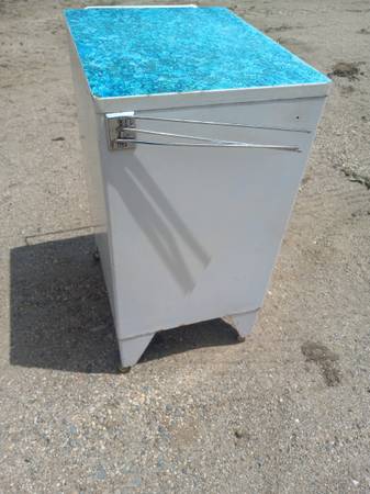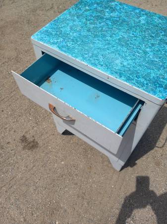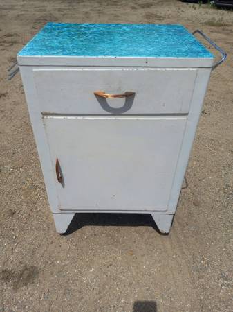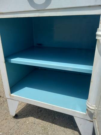 Nice 1950's small metal cabinet. Has one drawer two shelves on wheels. One of wheels is broken. It's 31in tall 20in wide 16in deep. Asking $45 o b o