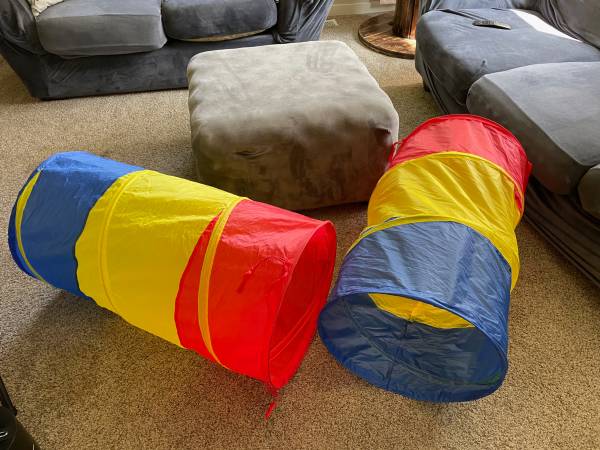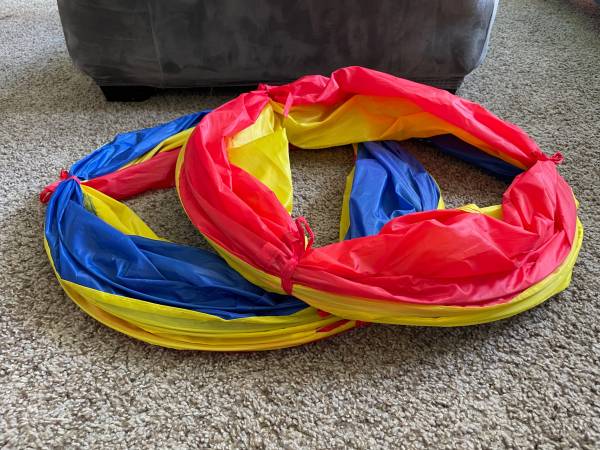 Brand new set of two play tunnels Red, yellow and blue Ties keep them folded compactly Dimensions: 33" length