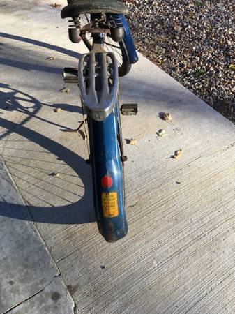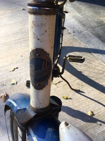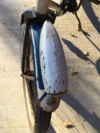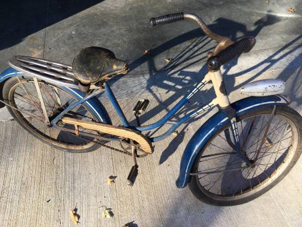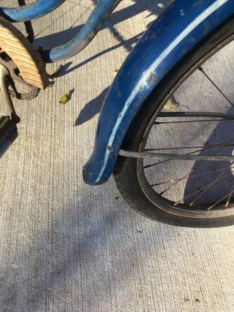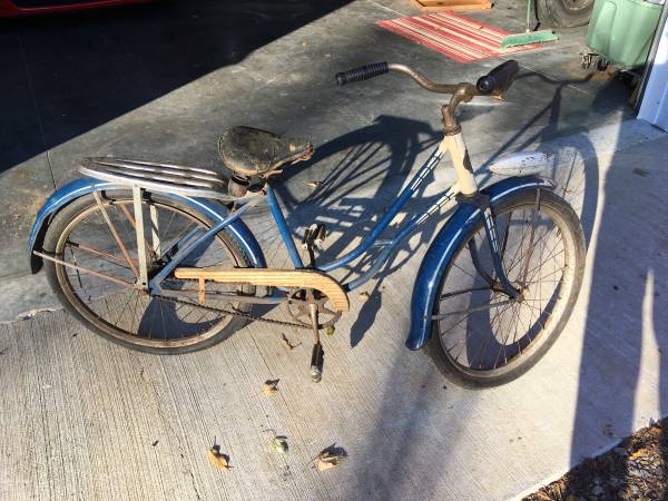 Antique Rambler fat tire women’s bicycle. Blue white white pin stripping. Mostly complete. Has rear rack, front fender light that is clean inside, no corrosion, original saddle, pedals, chain gaurd, flailed front fender, front badge. Only thing is rear reflector, that I can tell. Great for decor, or restore. Probably from 40s or 50s.