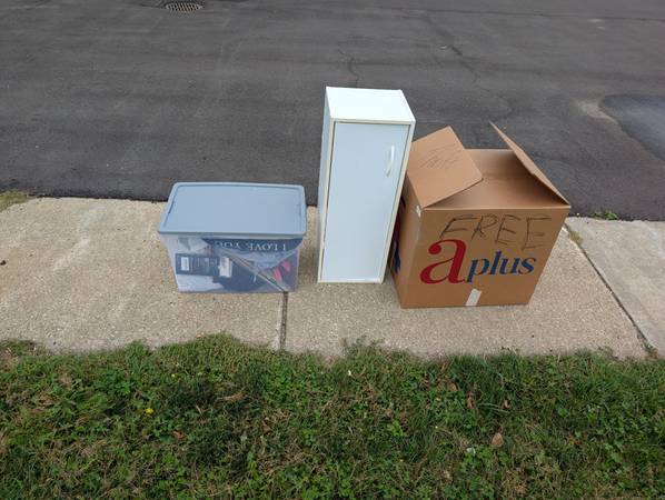 Free boxes of random clothing and other odds and ends. Small piece of furniture with door as well also free.