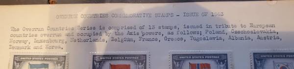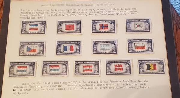 Part of my dad's stamp collection, shown is a page of "Overrun Countries Commemorative Stamps - Issue of 1943." These were the first stamps since 1893 to be printed by the American Bank Note Company and commemorate the 13 countries overrun during WWII. More explanations on this page. Let me know if interested. Text 2six9-nine13-four557.