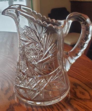 Beautiful ABP cut glass pitcher features pinwheel star pattern with fans and notched handle. This pitcher measures approximately 8 3/4" tall by 6 3/4" from spout to handle. This is in excellent condition with no chips, cracks or breaks and does have a few light scratches on the bottom. This will be a beautiful addition to your cut glass collection and will display beautifully. Let me know if you have questions. This has been in my family for years. Don't really know the history. 26nine-9one3-4five57.