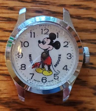 Selling this very collectible Swiss made Mickey Mouse watch, from the late 1950's to 1960's. I had it as a kid. It still ticks but has one hand missing (or arm). Has some small scratches on the back. Says "Base Metal Swiss 23" on the back. Let me know if interested. Text 269-nine13-four557 or email.