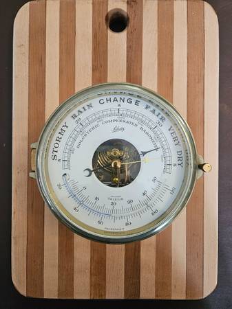 Vintage Schatz Ship's Clock Style Barometer has a brass case, a curved thermometer with a blue indicator and a beveled glass lens. 4 inches deep, base is 7 inches wide. Currently mounted on a wood cutting board with a hole in the back to access adjustor. Brass on top side could use a polish, but no damage/corrosion.