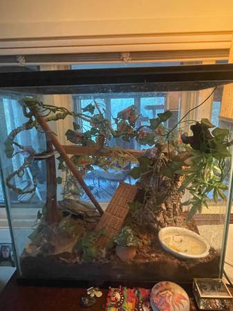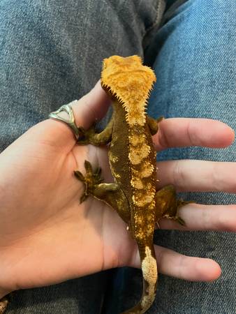 An active, healthy female crested gecko! She is about a year old and comes with everything she needs. A 30-ish gallon tank, small heat lamp, heat pad, and a large bag of watermelon Pangea. I’ve been a reptile keeper for years and I love cresties, but I simply can’t afford to keep them all.