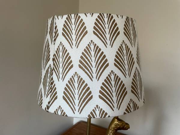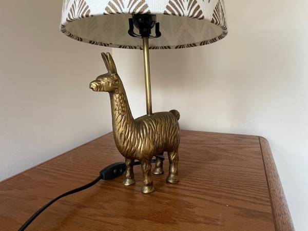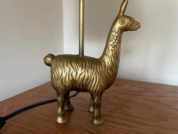Brand new -- Received as gift and never used Antique gold-colored lama/alpaca has nice weight to it. Lampshade is removable. Electrical cord has on/off toggle switch. Comes with lightbulb....