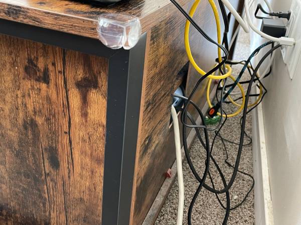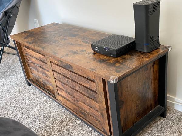 Rustic-stained laminate over probably particle board Two easy-glide (in tracks) doors barn doors open for interior storage Black metal frame Nice weight to it Finished back with two cutouts for...