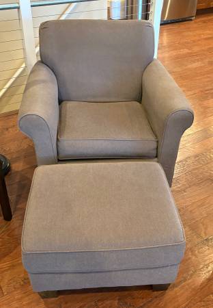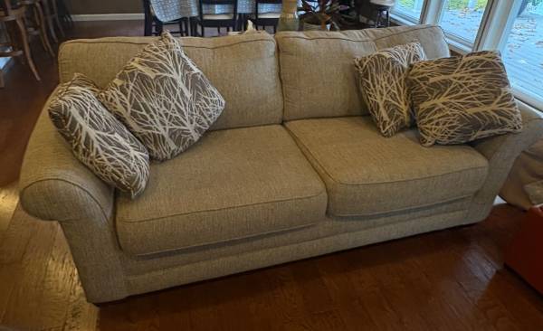 5 piece furniture set includes sofa, loveseat, arm charm with ottoman, and Flexsteel electric recliner w/ USB charging outlet. Includes six accent pillows as shown in pictures. All furniture was orig purchased and Vandenberg’s in Schoolcraft.