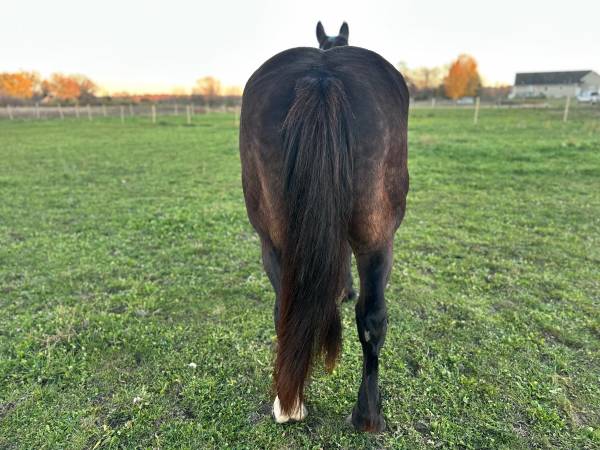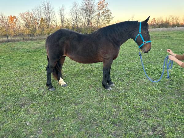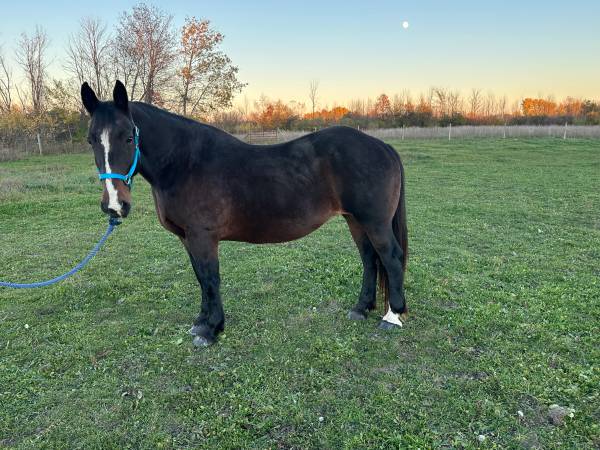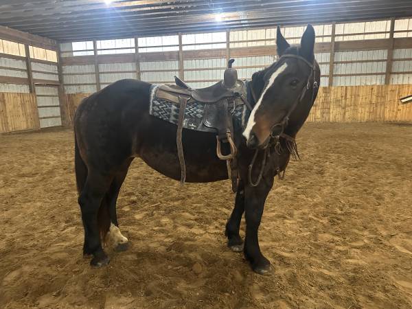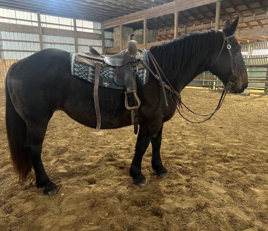 Heifer is a 20 yr old Draft Cross mare .. she stands 16 hands and as wide as a dump truck . Don’t let her age scare you she doesn’t look her age . She’s in very good shape . Will ride bareback or saddled . Super smooth trot. She is broke to drive but I don’t have a cart or wagon her size . Heifer is really gentle and easy going . Kids have ridden her and beginners . She goes where you point her , good stop and responds well . Great outside riding in the fields and around the farm , isn’t spooky. Very low on the pecking order. Stands tied , loads , hauls , stands for tacking up , grooming and mounting . Great trail horse for someone needing or wanting a thicker horse without being too tall .