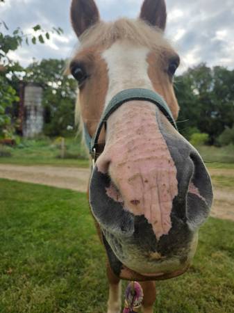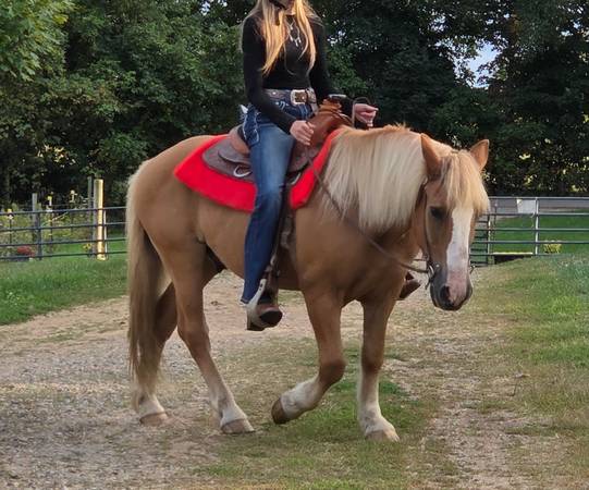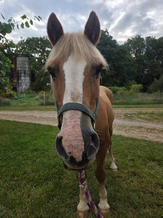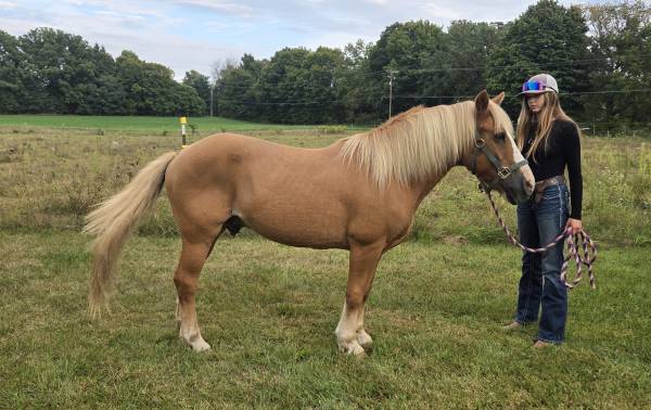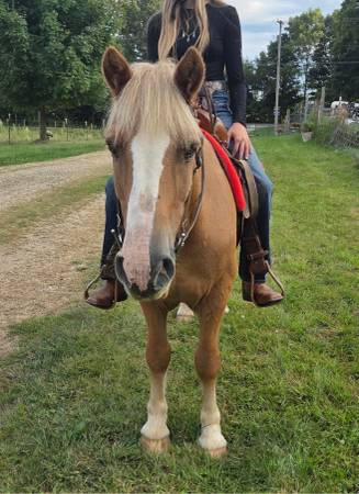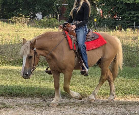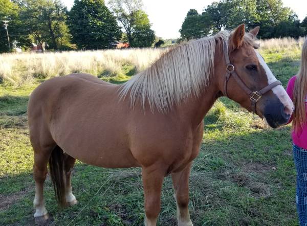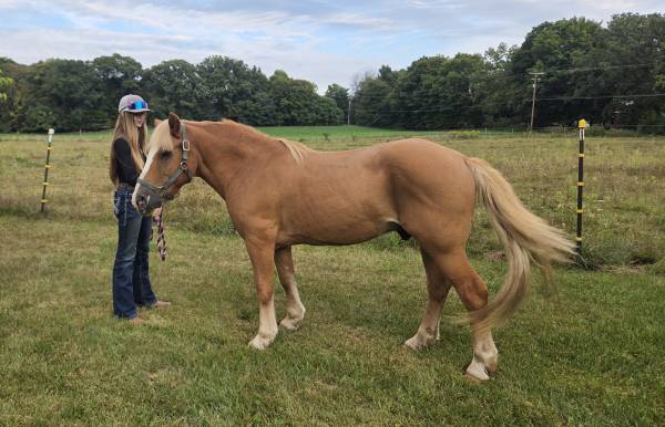 Draft-type Haflinger gelding for sale. Upper teens, approximately 13hh. Thick, muscular body. Big, solid feet. Low maintenance, friendly guy who loves his treats. Drives single and double. Been in parades and shown at county fair in past. Has also been ridden.