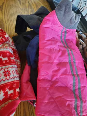 I have lots of baby goat / dog coats, sweaters, sweat shirts 5 / 10.00, treat toys 5.00, heating warmers pads 15.00, easy collars 10.00, feed dishes , litter training pan with rack 25.00, new washable pee pads, pants 4 paws 25.00 , belly bans 10.00, dog panties 10.00, crates s, l, xxl 30 to 75, bubble feeder 75.00 for new born kittens or pups, baby bottles for feeding pups, goats, kittens, small animals