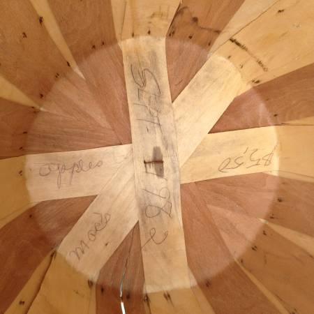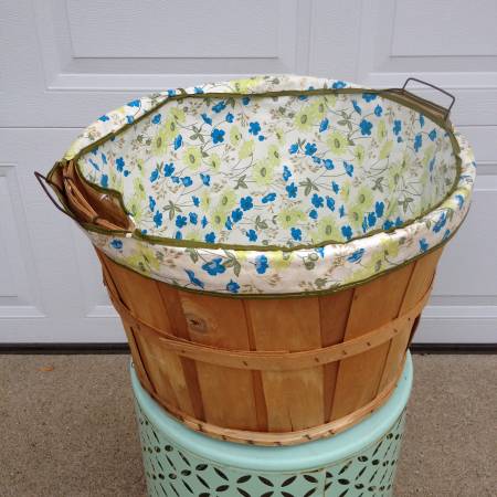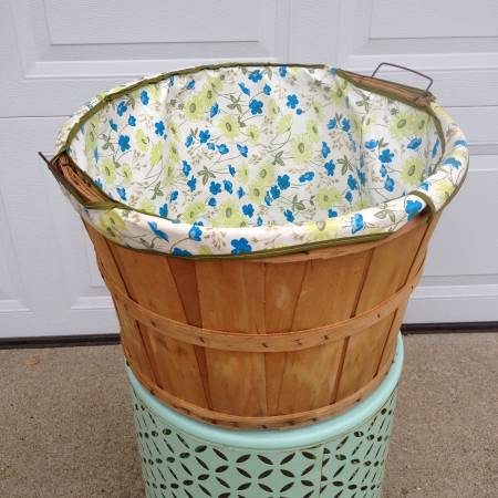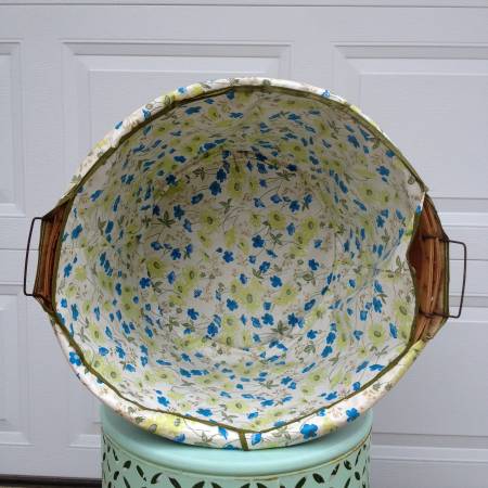 ➻ Blue and Green Floral with Leaves Vinyl Liner ➻ 17-3/4” Top diameter x 11-3/4” Height ➻ "Sept. 1982 - Apples Mac's $5.50" markings written inside of basket ➻ Metal Wire Handles (2) at top