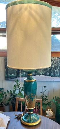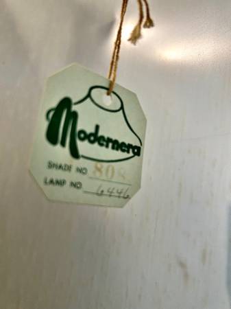 Vintage Moderna MCM lamp with original shade. Tags are still on it. About 35 inches to top of harp. 40” high with shade. Base is about 8 inches in diameter.