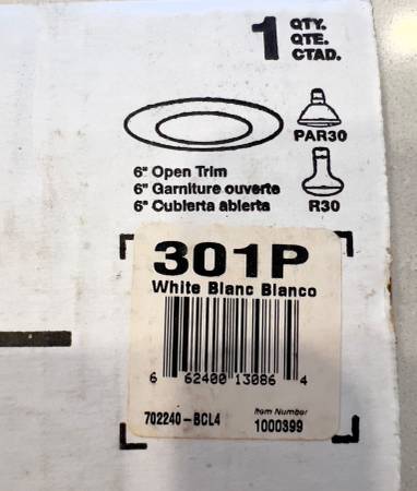 The 301P is a white open trim. This trim is a simple and economical choice for 6 in. recessed down lighting and it creates an attractive finished look. The coil spring retention allow for easy installation.