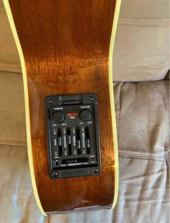 The cedar top gives it a kind of mellow but rich, lush tone, not too overpowering. Built-in Fishman Prefix Plus pre-amp works/sounds great. Action is low, plays very easy all the way up the neck.