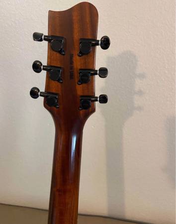 Solid cedar top with solid mahogany back and sides, ebony fretboard and bridge, bone nut and saddle, black hardware matches the face of the headstock.