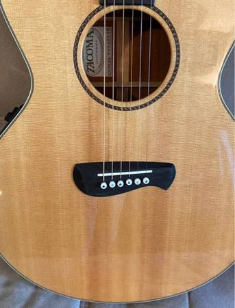 2001 Tacoma EM19CE4 acoustic-electric guitar. Excellent condition- I think it's the only gloss finished Tacoma I've ever seen with absolutely zero finish issues. In fantastic shape in general, amazing considering its age.