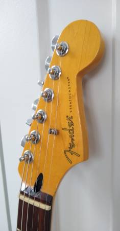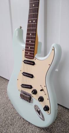 2010 Sonic Blue Fender strat Blacktop series. The original humbucker HH pickguard was replaced with a SSS guard and Ibanez V7 single coils from a 1984 Ibanez RS430 guitar. Very strat sounding with a bit of an edge to them. Locking tuners, 22 fret neck with 9.5" radius. The bridge is currently set up as a hard tail but vibrato/tremolo arm is included if you want to use it. Very good condition.