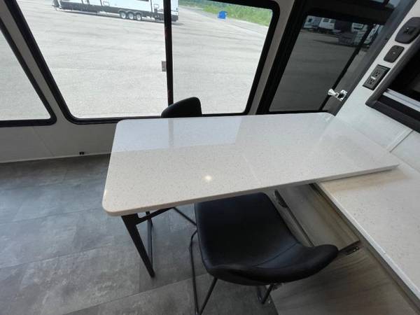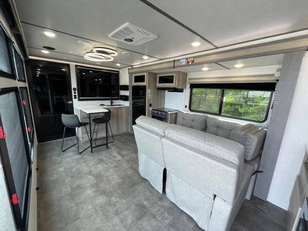 This versatile cargo trailer is one to remember! There is a ramp door that converts to a patio, a large slide out for more interior space, plus a front private bedroom just like at home. Your crew can relax on the super lounge across from the entertainment center or head outdoors to visit under the awning. The chef of your group will love cooking in the kitchen with ample counter space, including a bar top with two stools. There is also a kitchen bar window that will allow the cook to visit with those sitting on the patio, and if you need to bring bicycles along, you can easily load them in through the ramp door!