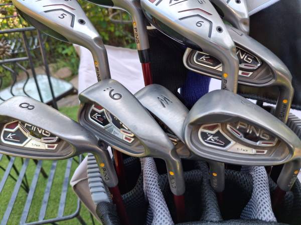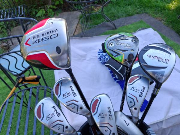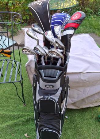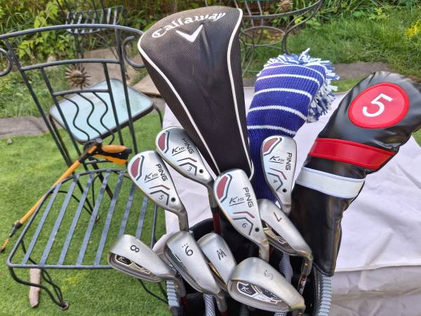 FOR SALE OR TRADE IS A HIGH-END COMPLETE SET OF PING HYBRID IRONS & CALLAWAY GOLF CLUBS W/ A $150 NEW CART BAG. THE CLUBS ARE REG FLEX & VERY EASY TO HIT. No PUTTER
