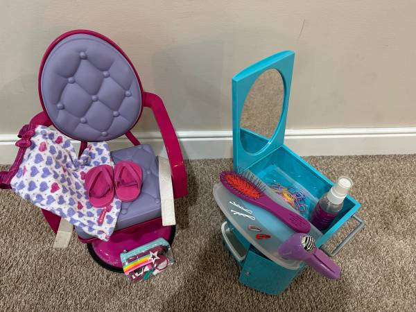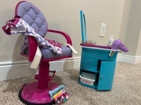 American Girl Doll Truly Blue hair styling caddy and American Girl Doll salon chair and wrap set. The 3rd item is an American Girl Doll toiletry accessory bag. All 3 come with accessories pictured here. Note that some of the original items from the set may be missing.