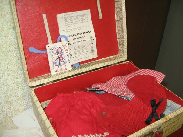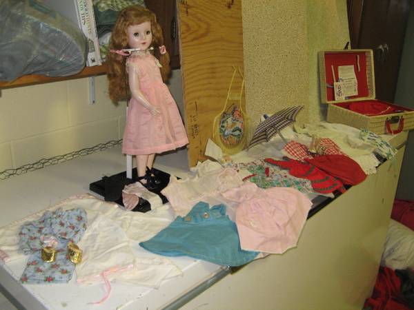 18" hard plastic "walker" with original hand tag and walking instructions. Dates to early 1950's; strawberry blonde Saran "hair". She is unmarked but has the original paperwork. Locking doll trunk with key includes several outfits and even a tiny umbrella that still works perfectly. Study the pictures as they are part of the description. From a non smoking home Phone calls only, show contact info