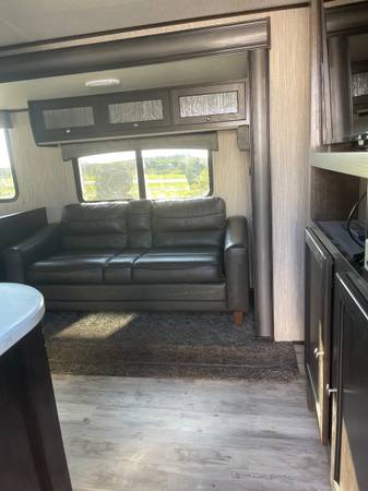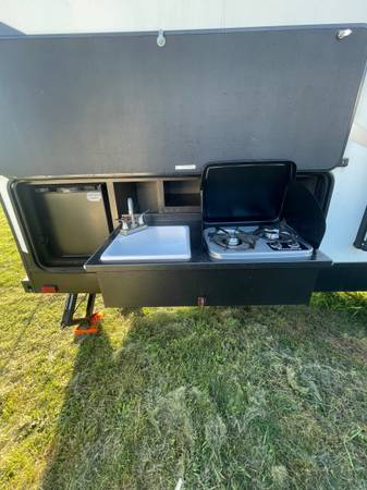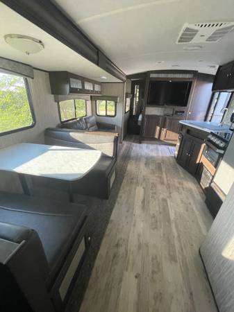 Immaculate 2020 travel trailer. Private queen bedroom with tv, large living room and dinette slide out, full size fridge and lots of cabinets . Rear bunk room with table and 3 beds. Table makes into a bed. Lots of storage. Outdoor kitchen with fridge, sink and 2 burner stove. Large automatic awning with lights and speakers. Trailer is an ultralight and has the winter all season insulation package. Come see this lovey trailer at a discounted price for quick sale. Price includes hitch and sway bars approximately 5980 lbs