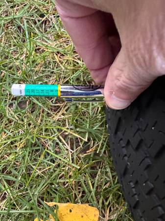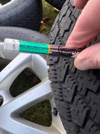 As you can see from the attached tread depth gauge pics, the tires probably have another season left in them before replacement is needed.
